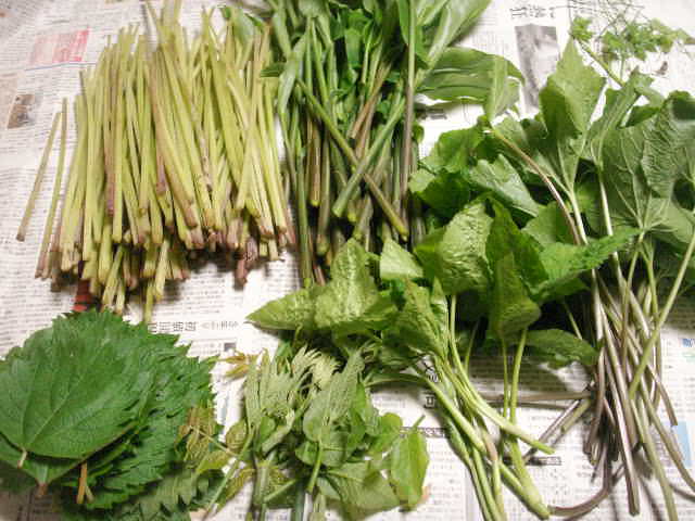 写真1:収穫の山菜 フキ、ミョウガの芽、ワサビの葉、ミツバ、タラの葉、ウドの葉など