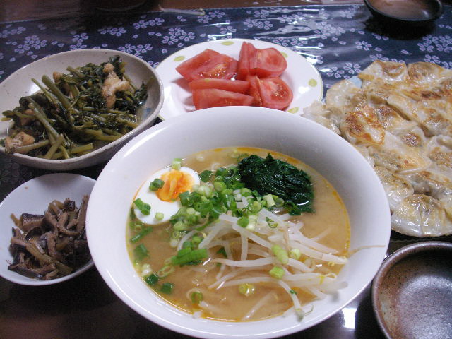 写真2:神戸からお取り寄せのラーメン、ギョウザなどと山菜料理2品