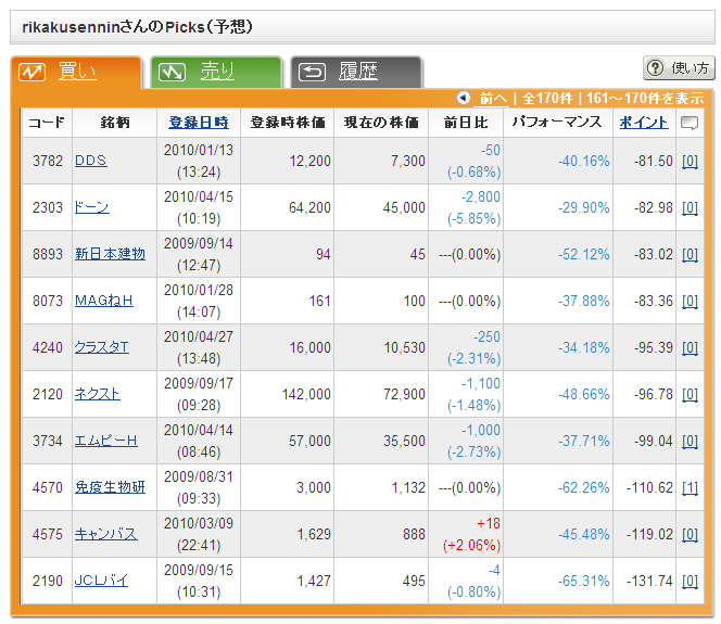 写真1:私の買い予想(170件)のポイント順の最後のページ(最悪ポイント)です。ヘタですね!!