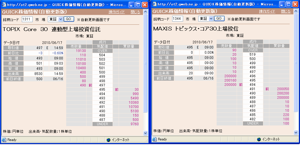 3枚の画像は本日大引けの板の様子である。引けの最良売買気配値とNAVとの乖離率の推移は、以下のWebページを参照のこと: