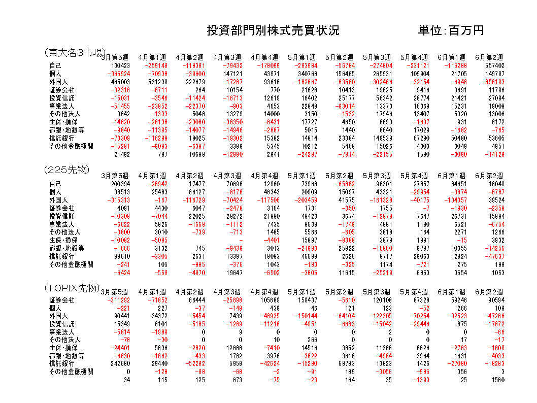 生保・損保は買い越し継続。先物は225買い越し転換。、TOPIX売り越し継続。