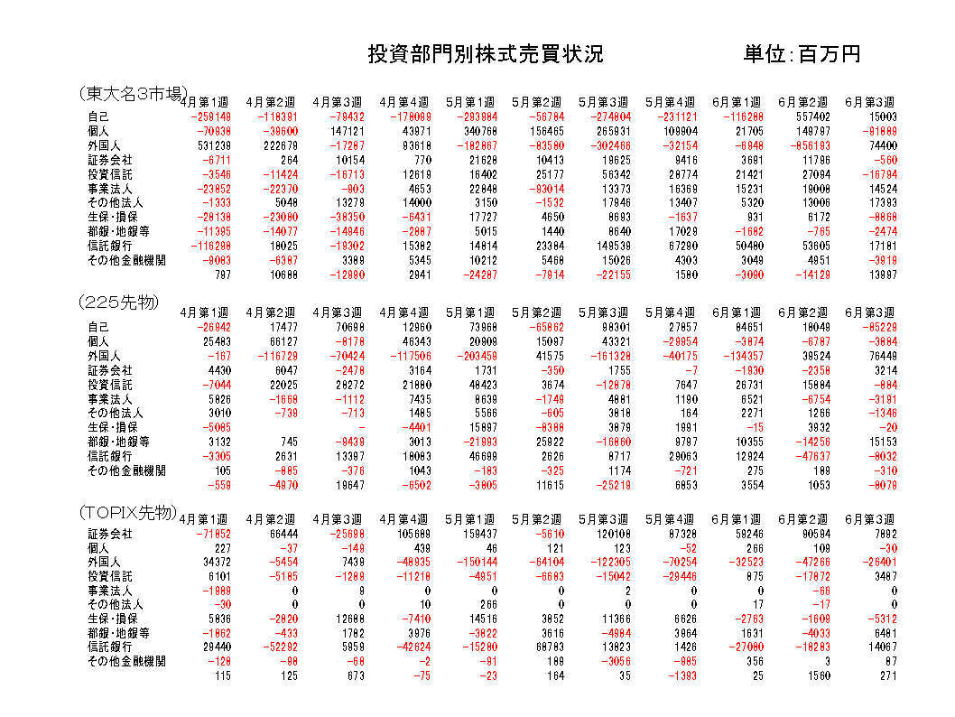 都銀・地銀等は売り越し継続。先物は買い越し転換。