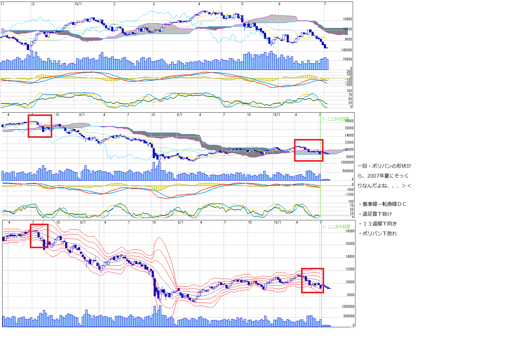 週足一目とボリバンの形状が2007年夏にそっくり、、、しかも月足ボリバンの形状までそっくり、、、 注意