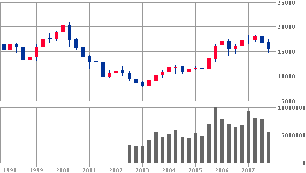 話題は変わりますが、景気循環という言葉があります。約10年のサイクルといわれますので、10年間のチャートを見てみます。2万円超えもあれば、1万円切れもあったのですね。今はその中間といったところですね。