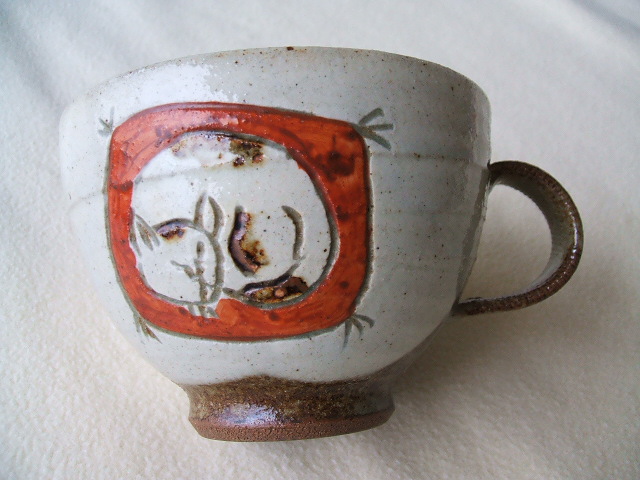 私の猫好きを御存知で、あるとき頂いたのがこのカップです。写真では見えづらいですが、座布団のうえに猫ちゃんが丸くなっておねんねしています。