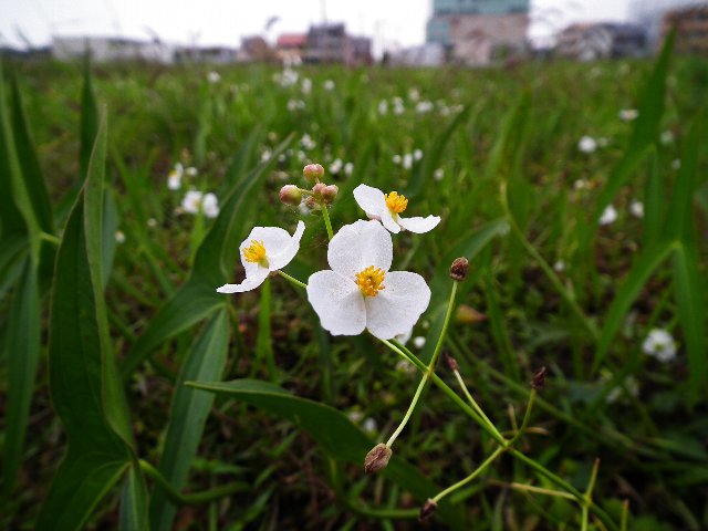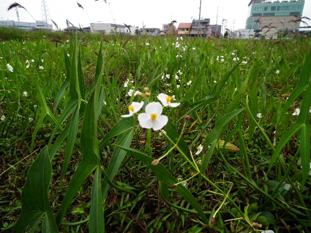 休耕田に繁殖して白い可憐な花を咲かせるオモダカはクワイにとてもよく似た水草です