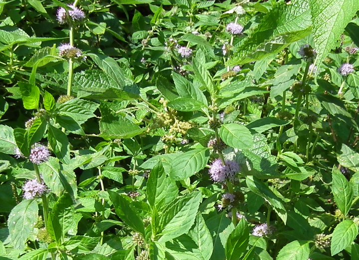 ミントの茂みに蜂が2匹、蜜を求めて花から花へ移ってます