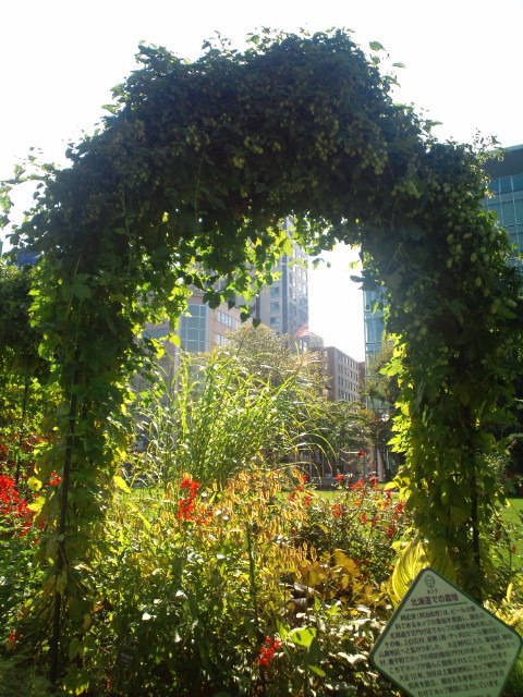 大通公園を散歩していると、アーチ状にホップが植えられていました。