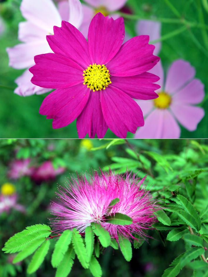>コスモスにねむの木の花、色鮮やかで綺麗ですね♪