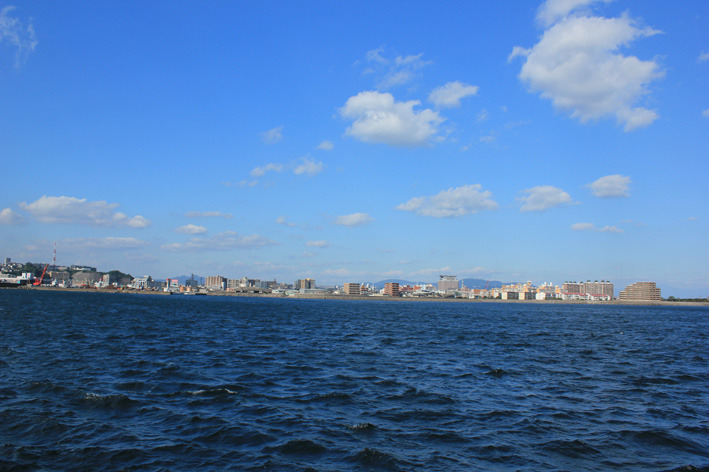 2枚目 散歩に行った港からみた鹿児島市内方面 高い建物が県庁です。