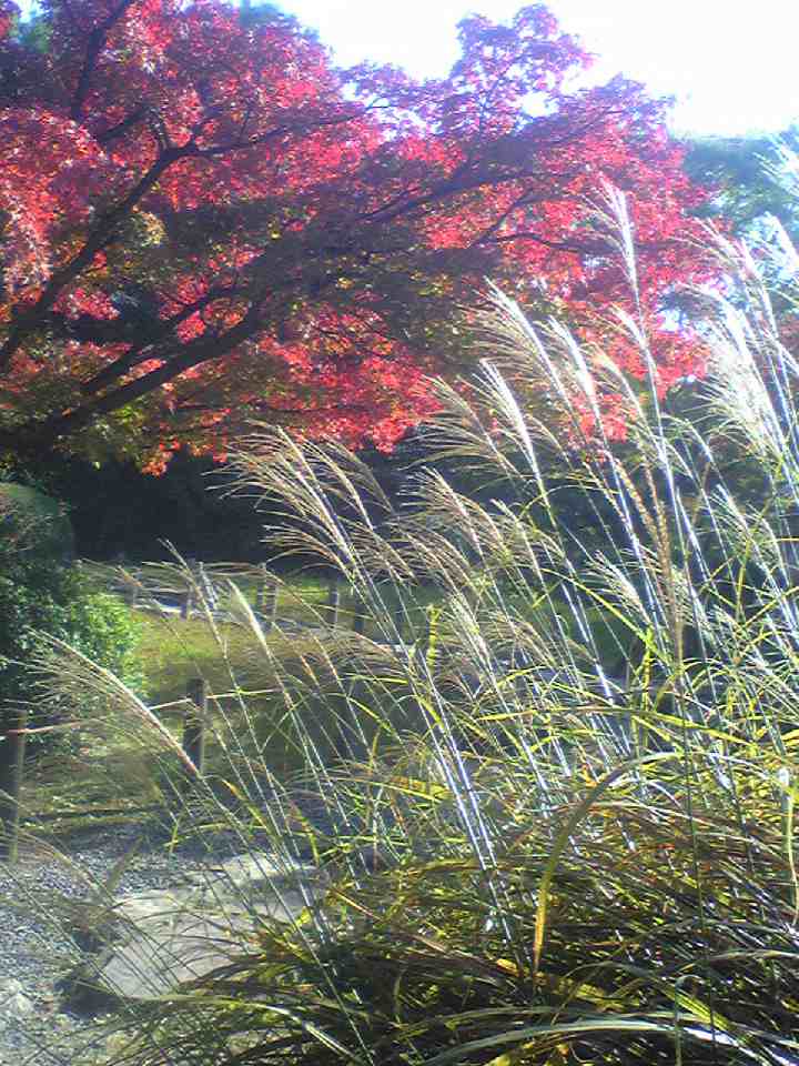 紅葉を見ながら金の茶釜のお茶をいただく。水琴窟のある庭のガラスに写る紅葉がきれいです。二の丸茶亭での風流な瞬間。3.二の丸茶亭前 サザンカ白