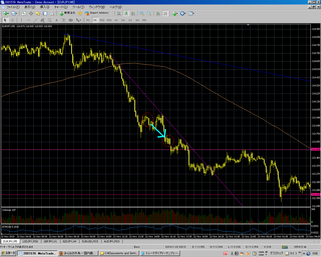 概要:11月22日~11月29日まで5トレード行っていました。まとめている時間がうまくとれなかったので今日まとめてトレードを振り返ります。まずは11月22日より。いやーだめなトレードは振り返るとなぜここでエントリーと考えてしまいます。。笑 人間の心理恐るべし。落胆ではなく、反省して次のトレードに生かしていきまーす。