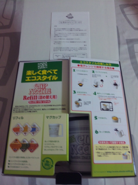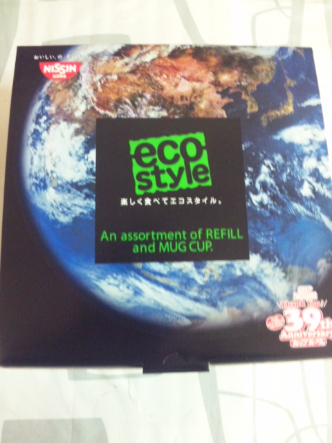 楽しく食べてエコスタイル(ecostyle)と箱には書いてあり、コップと6パックのラーメンとうどんが。