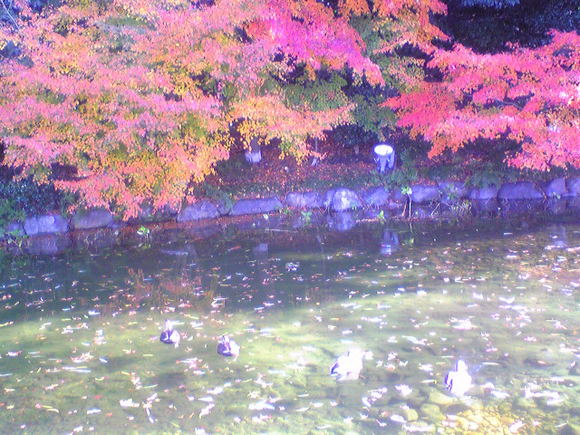 冬の徳川園は暖かいのか、綺麗な紅葉が見事です。かもも泳いで紅葉狩りです。庭園の西側は落ち葉が綺麗でした。