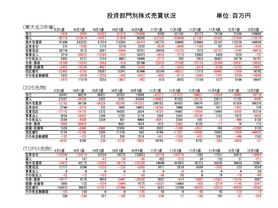 個人は売り越し継続。先物は225売り越し転換、TOPIX売り越し転換。