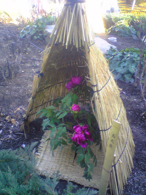 冬牡丹です。今日から徳川園で始まりました。暖かいとこから移植し、枯れてるのもありました。きっと休みの間に突貫工事でしょう。一つ一つ藁を編んだコモを手で丁寧に調整してかけてあります。1.紅輝獅子2.真昼間3.冬牡丹の全景