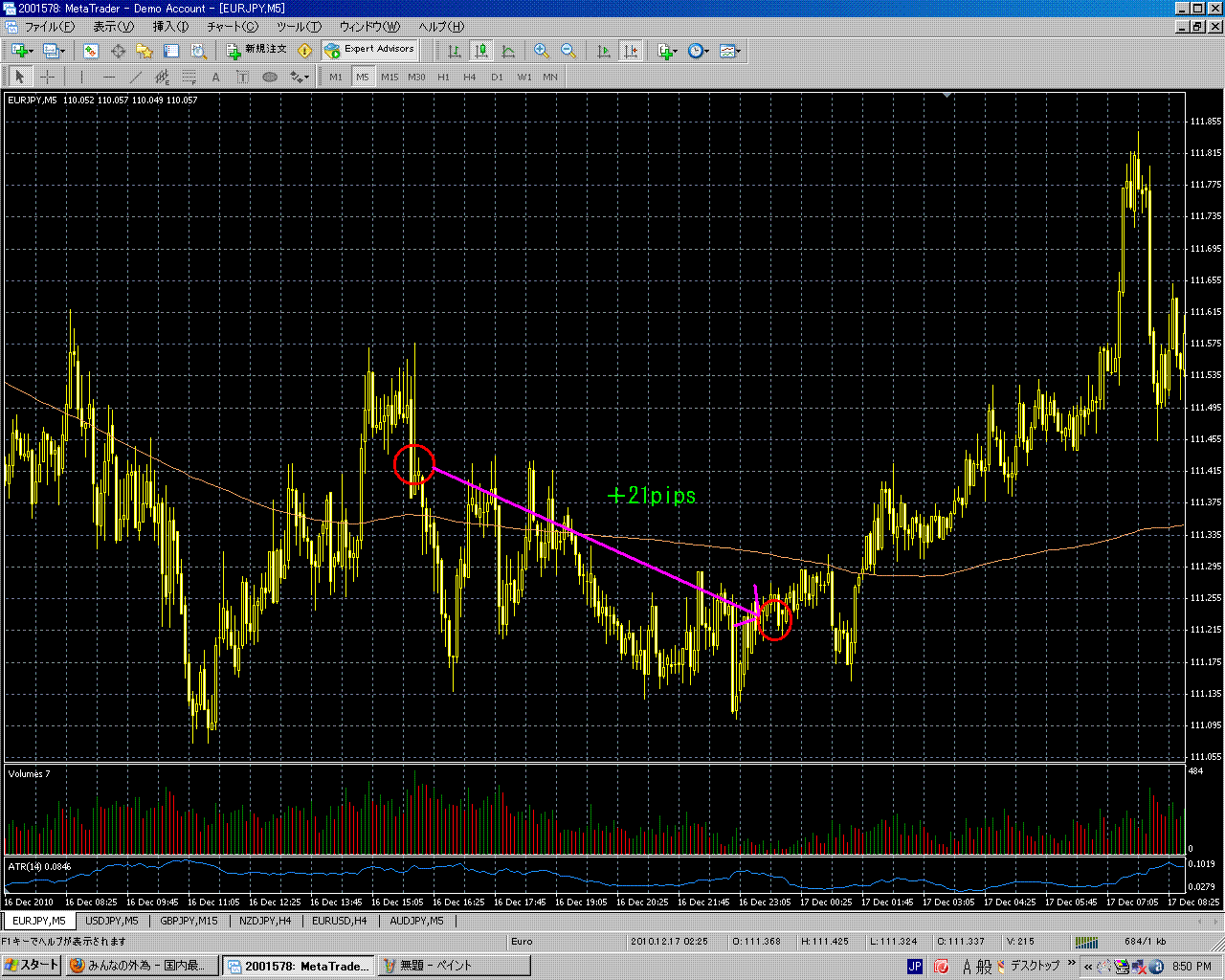 理由 : 111.62と111.42と111.10のレンジで相場を見ていた、111.32から+30pipsほど上昇し、レンジ上部に到達。ブレイクするそぶりの上髭を2つ確認し、111.42のレンジまで戻ってきたときに売りのトレード。