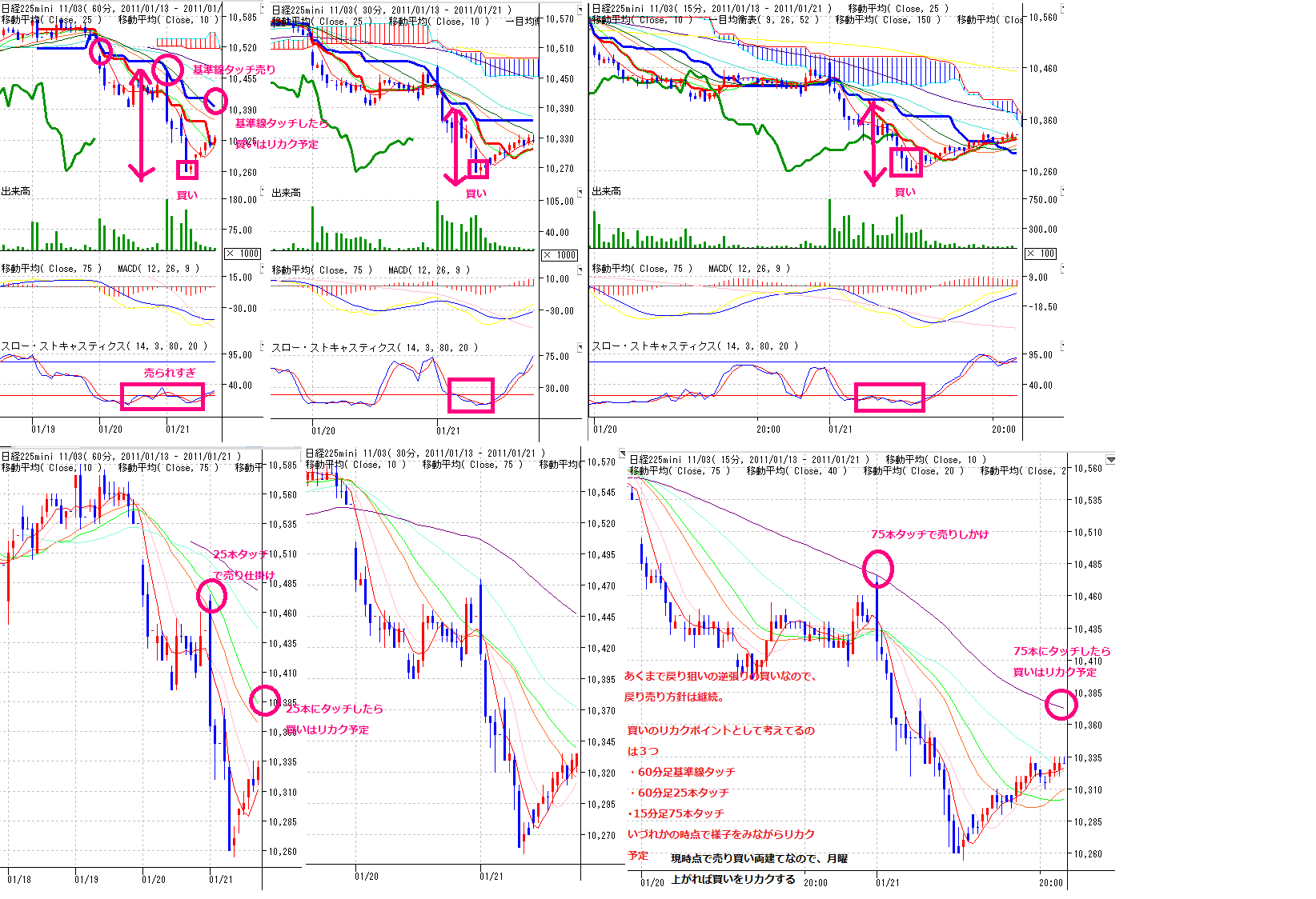 ・今日は、円安で戻ってきたので、いったん↑を試してくるだろう、とおもって、10530に指値売りだしてたのですが、ヒットせず、下げ相場にまったく乗れませんでした><