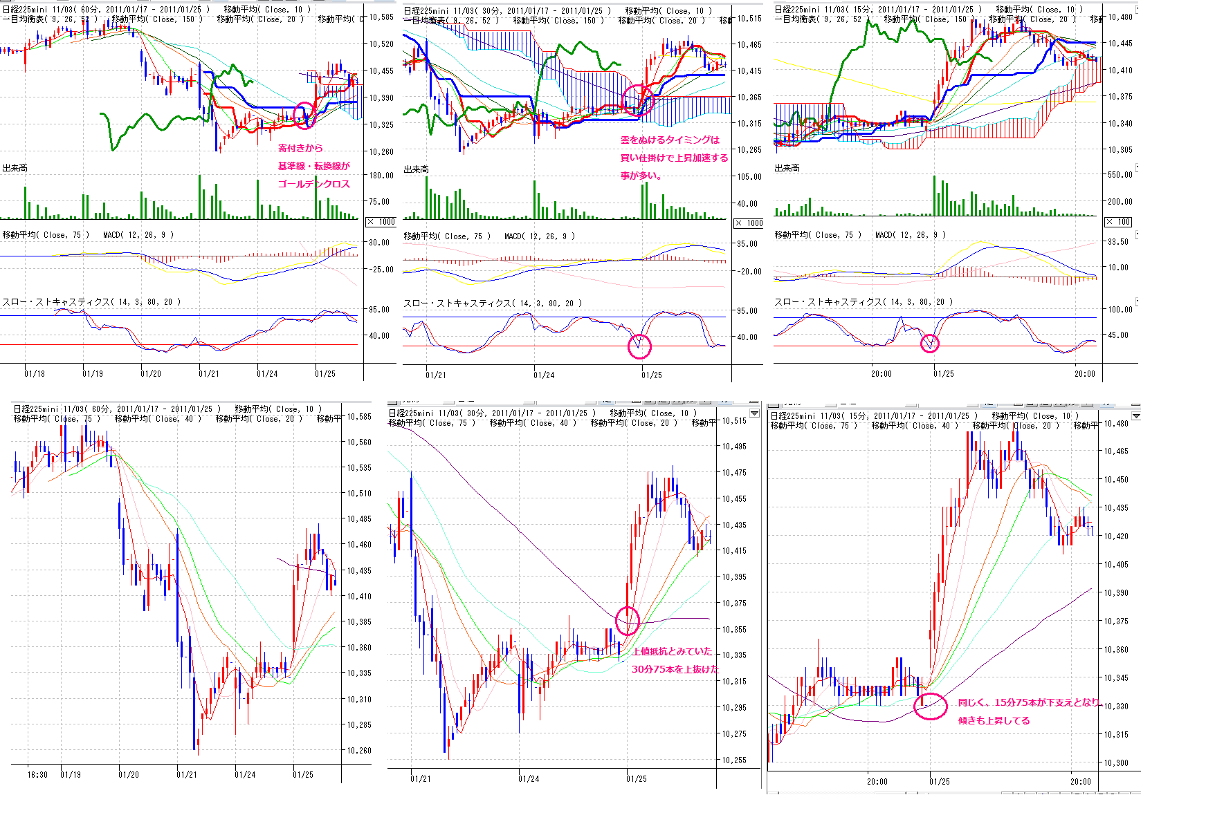 ・60分基準線が上値抵抗となっていたけど、基準線を上抜き、さらに転換線とゴールデンクロス
