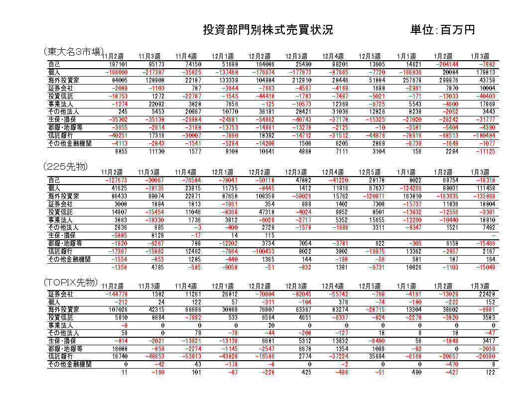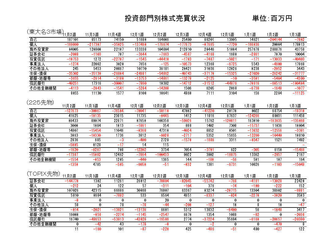 生保・損保は売り越し継続。先物はTOPIX買い越し転換。