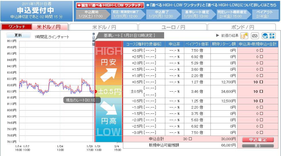 それとは別に全く動かなかったとき用に±50pips(図の真ん中ですね)にも10口購入!