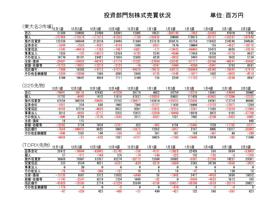 生保・損保は売り越し継続。先物は225先物買い越し、TOPIX買い越し継続。
