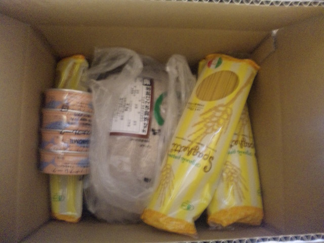 主食系かな??白米5K、玄米4K、パスタ3袋、ツナ缶4つです。