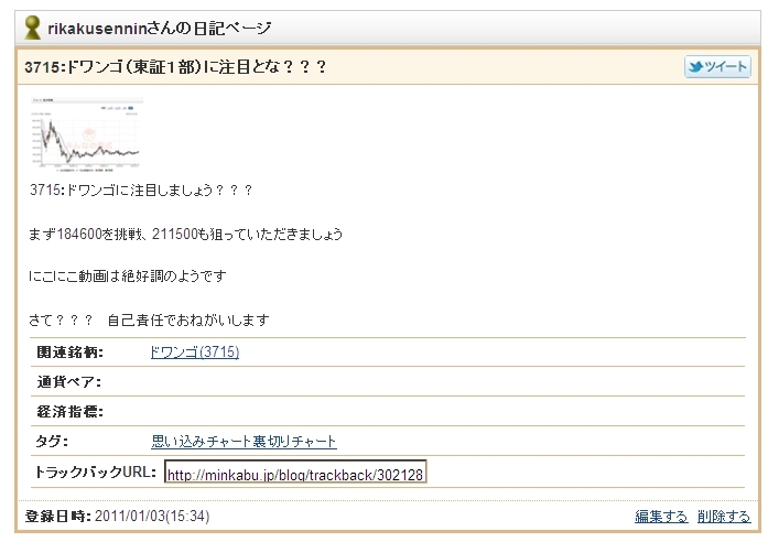 1月3日の日記で、「3715:ドワンゴ(東証1部)に注目とな???」と書きましたが