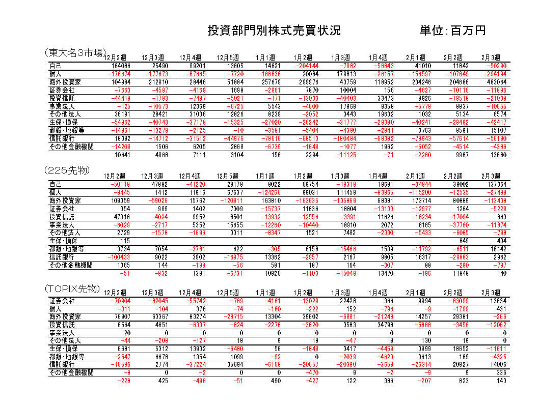都銀・地銀等は買い越し継続。先物は225買い越し転換、TOPIX売り越し転換。