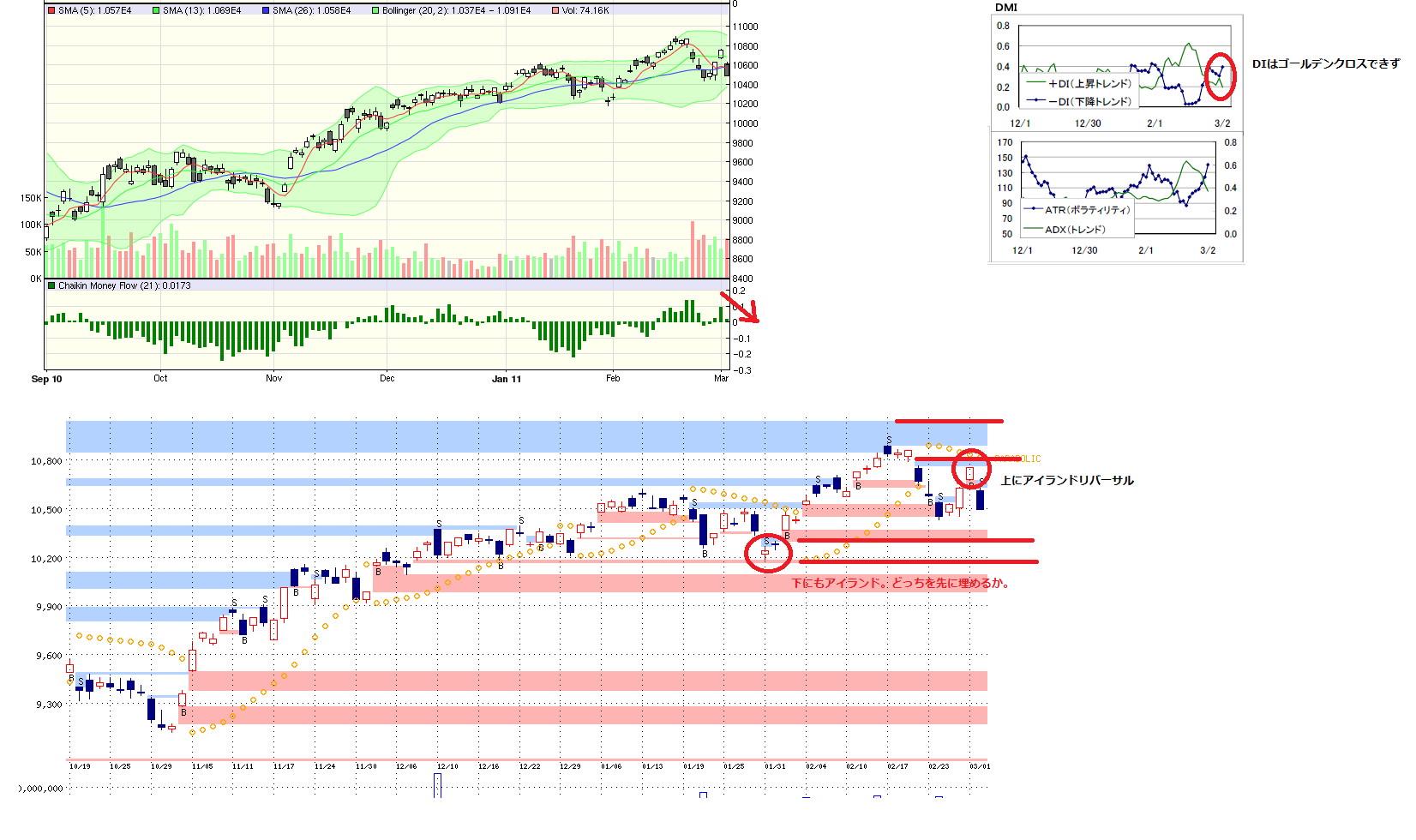 ☆おとといは、10600で戻り高値をつけて再度下落の三尊パターンを想定して、売り持ちだったのですが、昨日の上昇でやむなくヘッジしたとたん今日の下げ、、、><