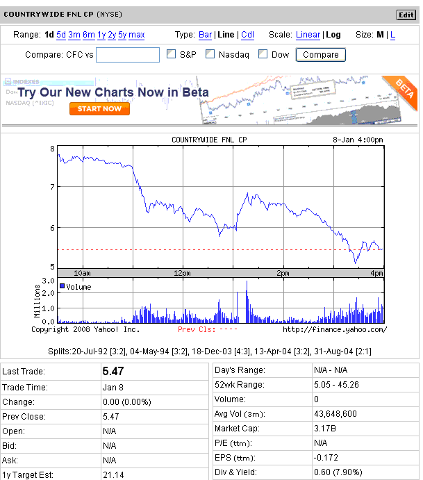 カントリーワイド・ファイナンシャルの破綻の噂や、AT&TのCEOが「消費者向け部門では事業の伸びがやや鈍化している」と述べたことから、景気減速懸念で大幅下落となりました。ナスダック総合指数は8営業日続落。金は高値更新。