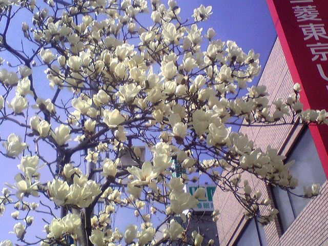 桜より一足先に咲くのがハクモクレン。紫色の モクレンはシモクレンと呼び区別されることがある。また、この時期には コブシもよく似た花を開く。花の下に2枚の小さな葉を付けているのがコブシで、ハクモクレンの花の時期にはまだ葉が出ていない