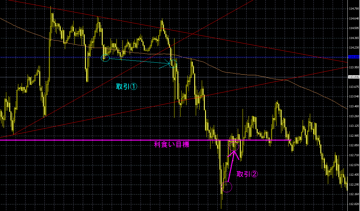 理由 : 112.00円まできれいな3段下げ、112円の動きを注視し、下髭1回確認、2回目下値切り上げを確認して買いでエントリー。