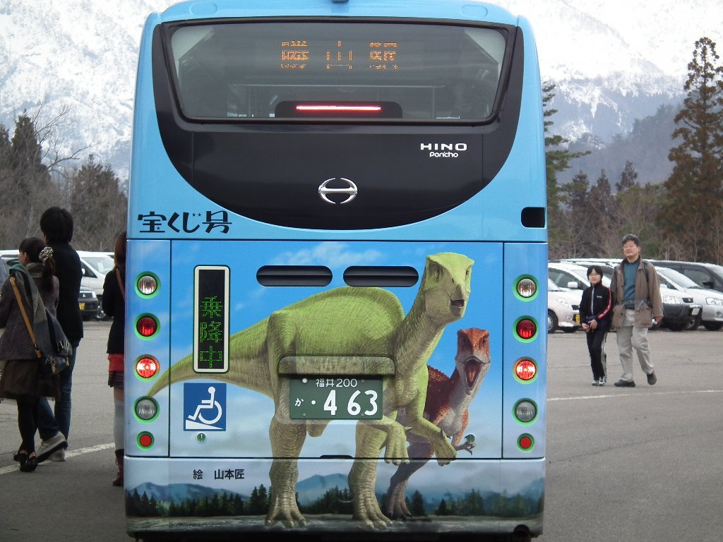 写真は勝山駅と会場の間を運行している恐竜バスです