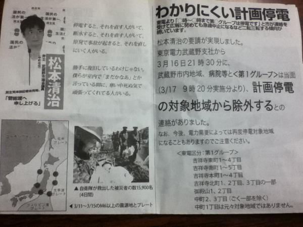 ”昨日実家行ったらこんなチラシが来てた。この人、菅総理の元秘書じゃないか。吉祥寺は菅総理の家もあるし、色々邪推するな・・・。”