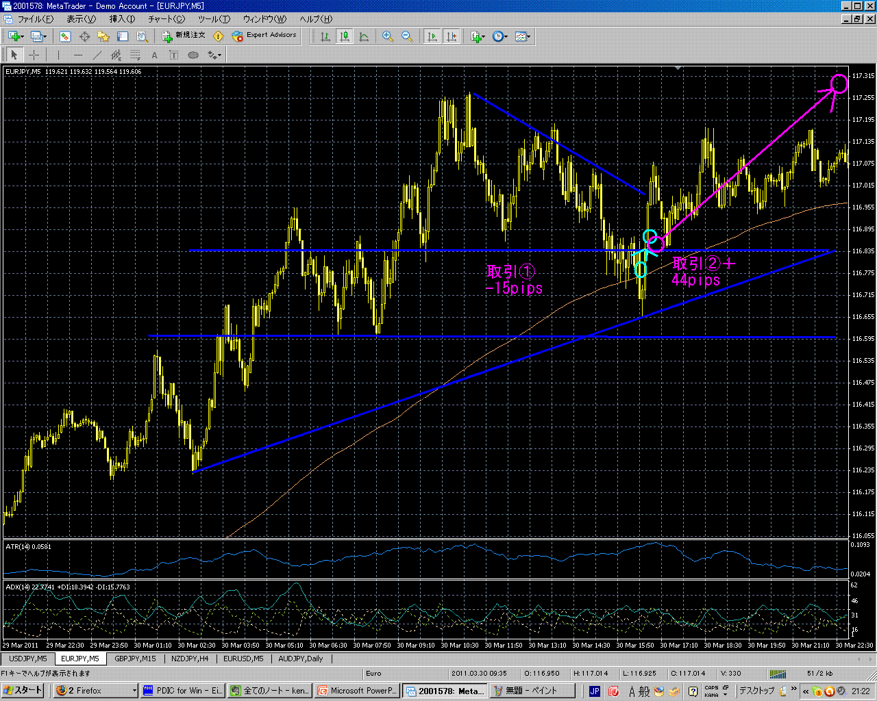 理由 : 取引①でのイメージ(移動平均線を下にブレイクしてV字で反発)どうりの動きになったためエントリー