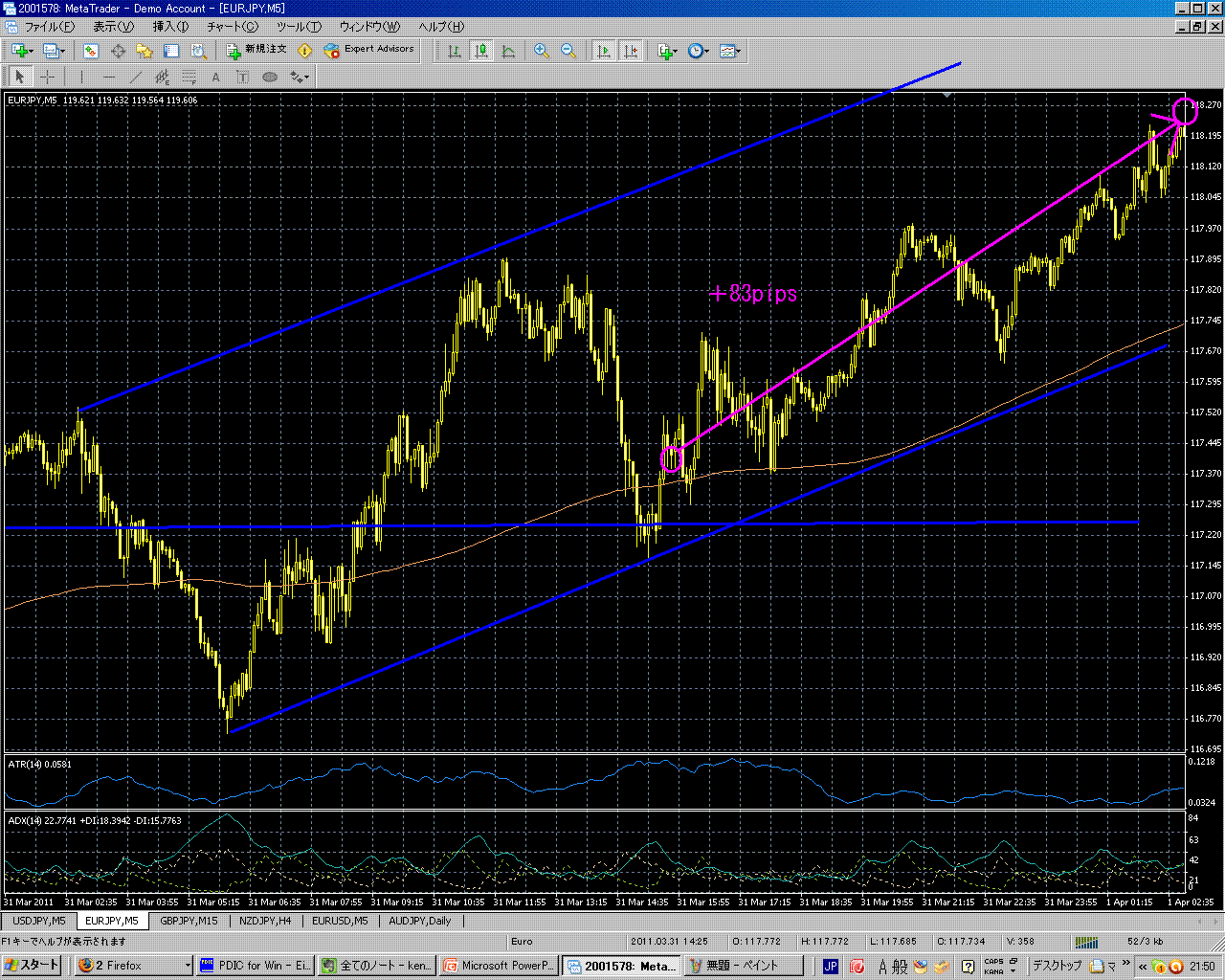 反省点: イメージ通りのトレードなので納得のいくトレードだった。75点は与えられる。大きなトレンドにのった押目のトレード手法はこの理由に記したトレードで利益があげられる可能性大きい。この手法を磨いていく。今月はたまたま、動きが大きく稼ぎやすい月だったと考えられる。動きが少ない月でもマイナスを広げずに如何に負けないかを考えたトレードをしたい。 今回のトレード自体は損切りはきちっとできたし、また利食いも、イメージ通りであったので◎。利を伸ばせたと思う。