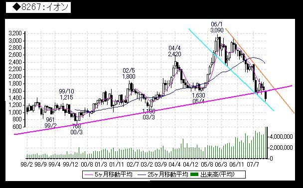イオンくんの株が上昇していたのは、バブル崩壊後に民事再生などで、安くたたいて買った桃が、甘く美味しかったので食べ杉てオッキクなりましたが、大規模店舗法など、頭打ちとなったことで話題性にかけるのと、業績が下方なので期待分が下がってまつ♪こっから先の下落は、将来を織り込みとなる予定っす♪ハイ