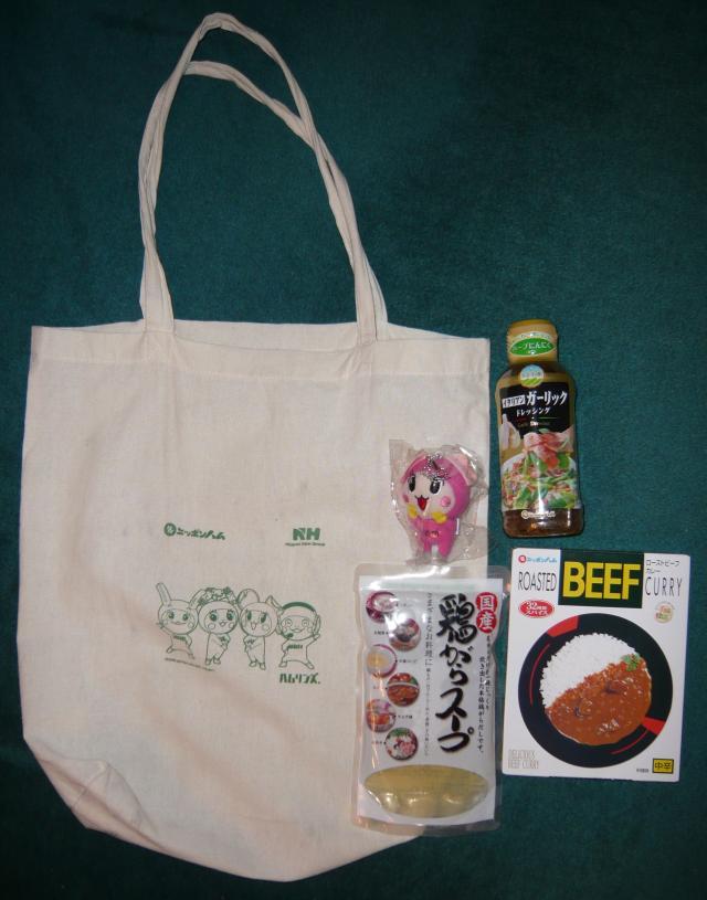 写真右 お土産のエコバック、レトルトカレー、トリガラスープの元、イタリアンガーリックドレッシング、ハムリンズ(ハミュー)人形