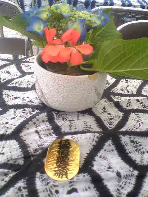有松絞りまつりで休憩をと立ち寄ったら5拾億両の小判を渡され大笑いでした。絞りのテーブルクロス高そうです。