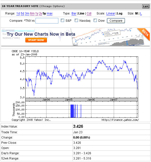 アップルやモトローラの決算を受け大幅安で始まりましたが、金融保障会社支援のニュースや銀行株の投資判断引き上げのニュースにより、後半に戻して大幅反発となりました。長期国債の利回りの水準がもの凄いことになってますね。FFレート1%で景気の底だった2003年と同レベル。日本の長期国債も量的緩和をしていた時と同じくらいの水準まで買われています。