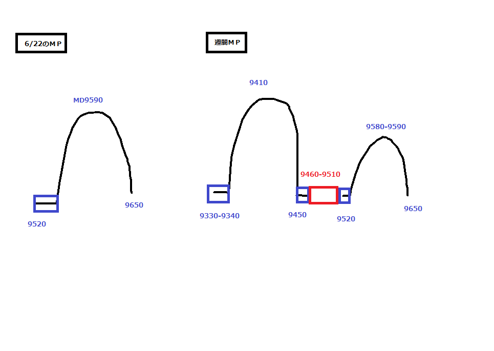 ブレイクしたトレンドラインが9500近辺なので、まずはここで支えられるか、再度9500をわれてくるようなら戻り売り目線に。