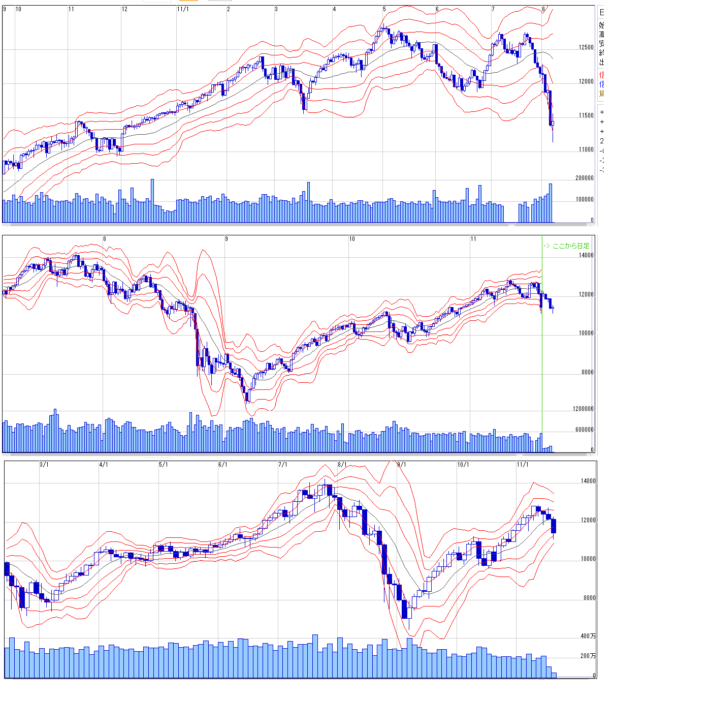 他にも24ヶ月線や100週線、200週線や週足雲下限など、10700~11000には一応抵抗線はあるので、ここらで反発できるか。