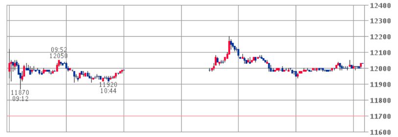 13:10売り、12040円。→呑まれる覚悟で伸びる事を期待して待ったが残念。