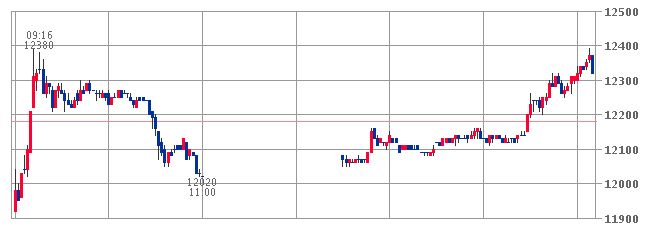 14:30買い、12180円。→日経と異なり終わりで上げてきたので手仕舞い。