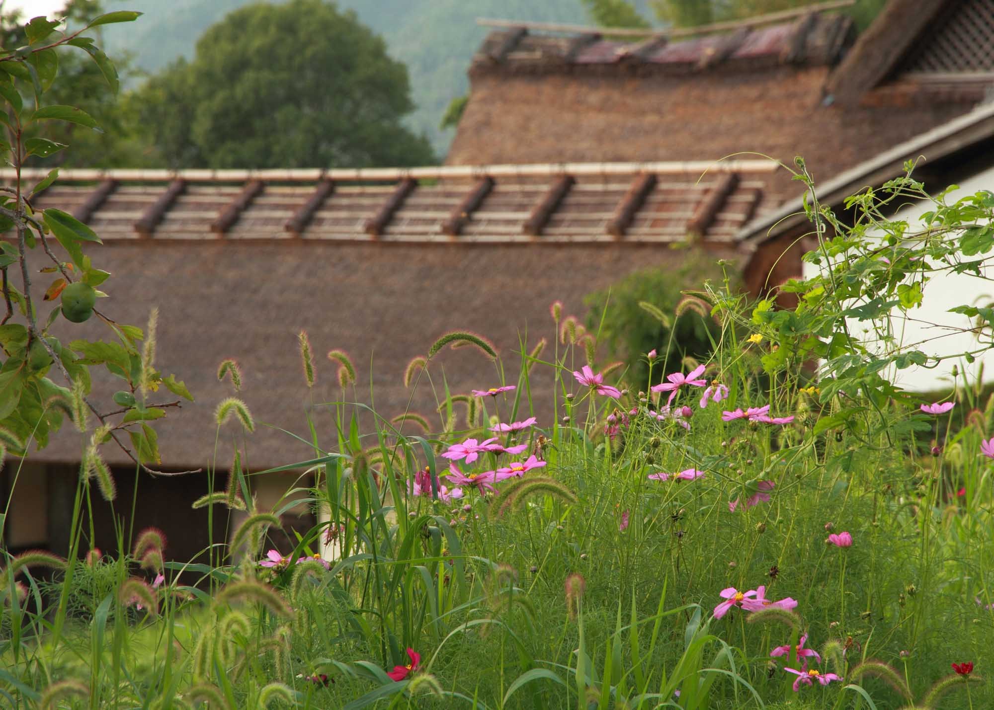 背景の建物は、年代が確定している民家としては京都市最古で 江戸時代の初めに建てられたものです。 日本の中でも古い民家です。
