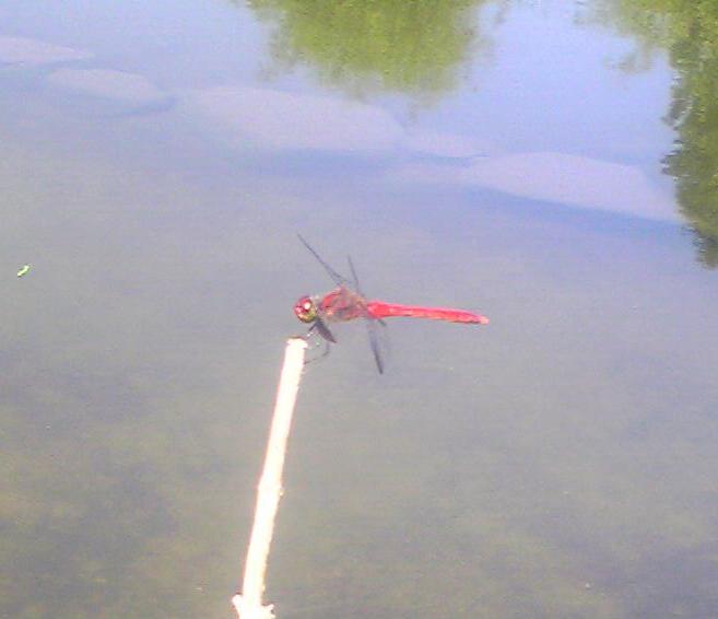 赤とんぼ真っ赤になる2011年09月30日赤とんぼが真っ赤になってきました。秋の深まりでしょう。種類はアキアカネでなくマユタテアカネでしょう。まだ、アキアカネは降りてきていません。偶然ですが、池の左上にこの蜻蛉を狙って寄ってきたと思われるカマキリが池に落っこちて、魚に食べられるばかりです。自然の厳しさを感じます。
