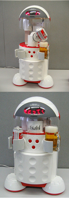 簡単に言うとロボットのお腹(冷蔵庫)にビールを入れておいて、ビールを飲みたいときにスイッチ入れる→ロボットがビールをお腹から取り出し、セットしたジョッキに注いでくれる、というものです。しかもジョッキに注ぐとき「お疲れ様です」とか言ってくれるスグレモノ(?)です。