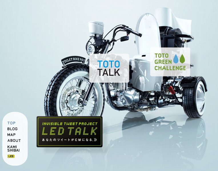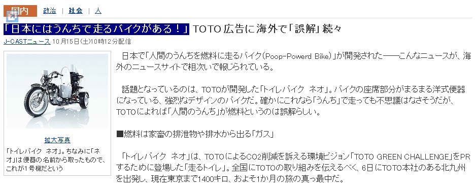 これは、TOTOが発表した、排泄物を原料にして出るガスを燃料としたバイオ燃料のバイクですが、
