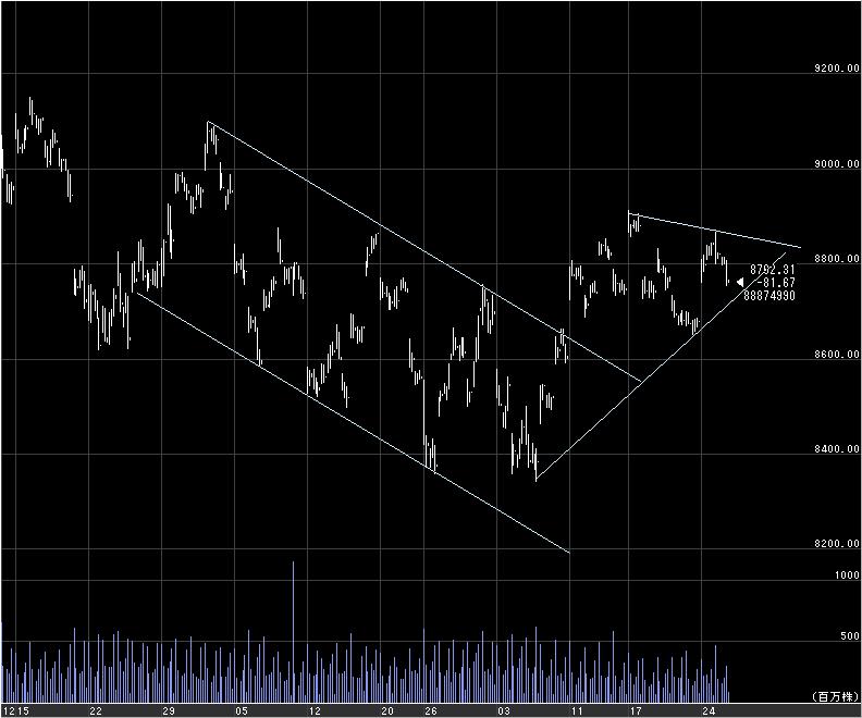 本日は寄り付きで窓を埋めた後はずるずると下落。前日の陽線をほぼ包んでしまいました。